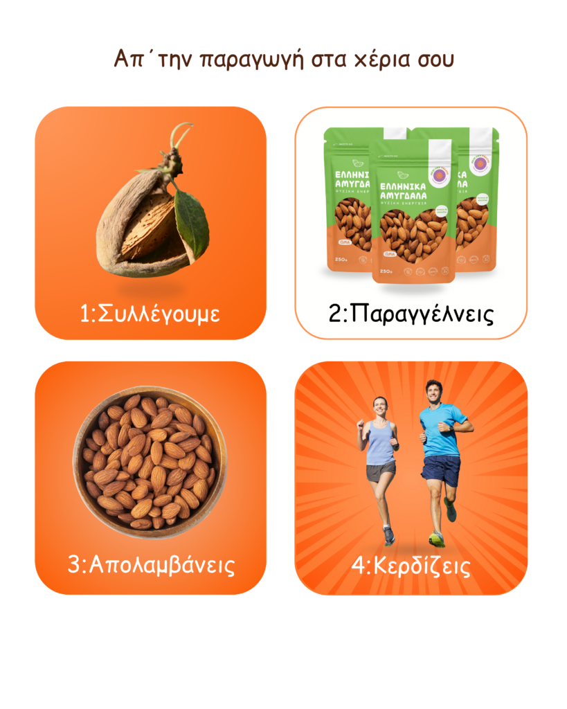 Τα αμύγδαλά μας είναι 100% φυσικά, χωρίς πρόσθετα, χωρίς συντηρητικά και χωρίς καμία επεξεργασία. Συλλέγονται με προσοχή και συσκευάζονται άμεσα για να κρατούν όλη τη φρεσκάδα και τη θρεπτική τους αξία.